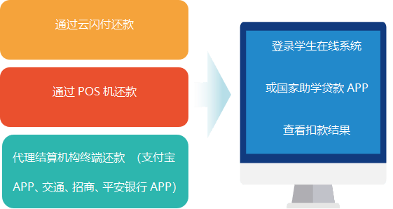 除了将还款资金存入合同约定的代理结算机构指定账户等待年度扣款以外,借款学生还可以通过代理结算机构APP、云闪付APP、助学贷款专用POS机等途径进行主动还款操作。