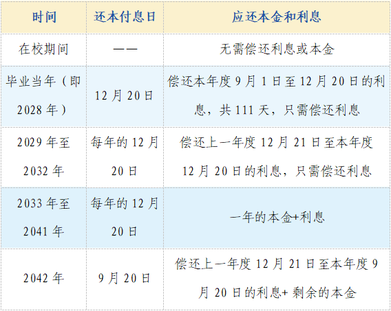 以某位大一新生2025年申请一笔期限为17年的生源地信用助学贷款,其大学学制为三年,还款计划如下:
