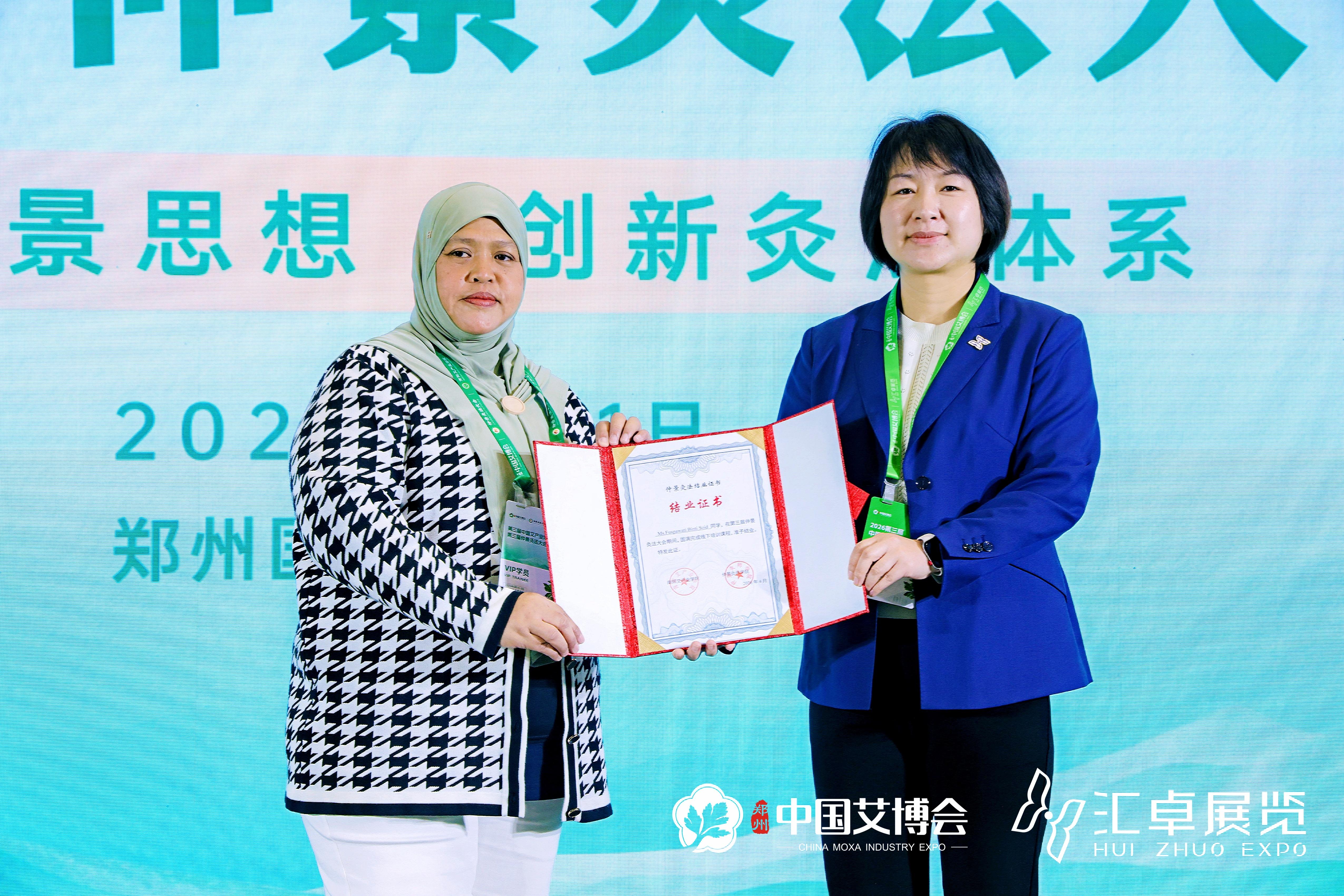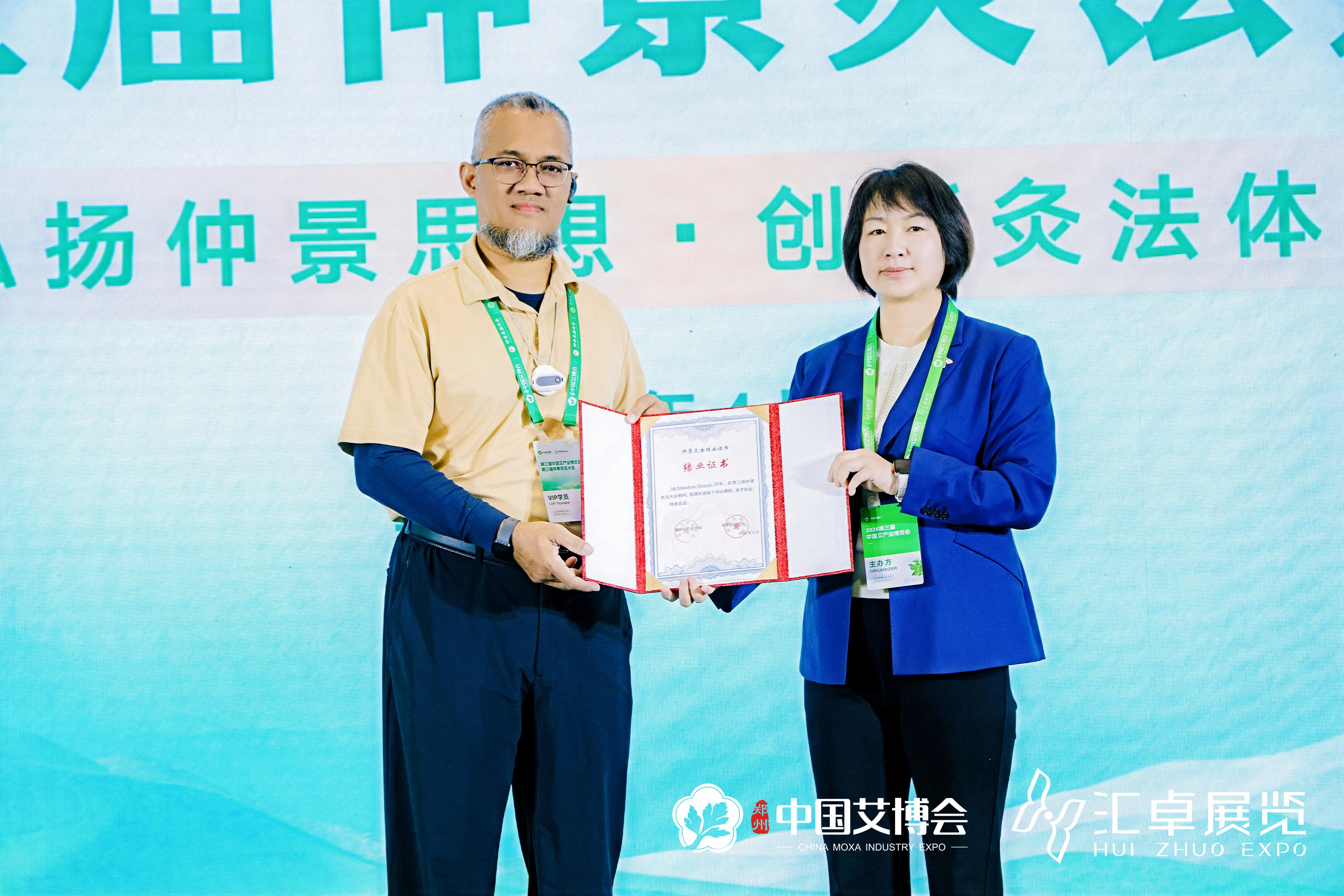 潘华教授等讲师团成员从多维度、全方位阐述仲景灸方的独特魅力和生动鲜活的临床案例,为仲景灸法在新时代的创新发展开阔思路。会议现场还为多位外国友人颁发了仲景灸师结业证书。